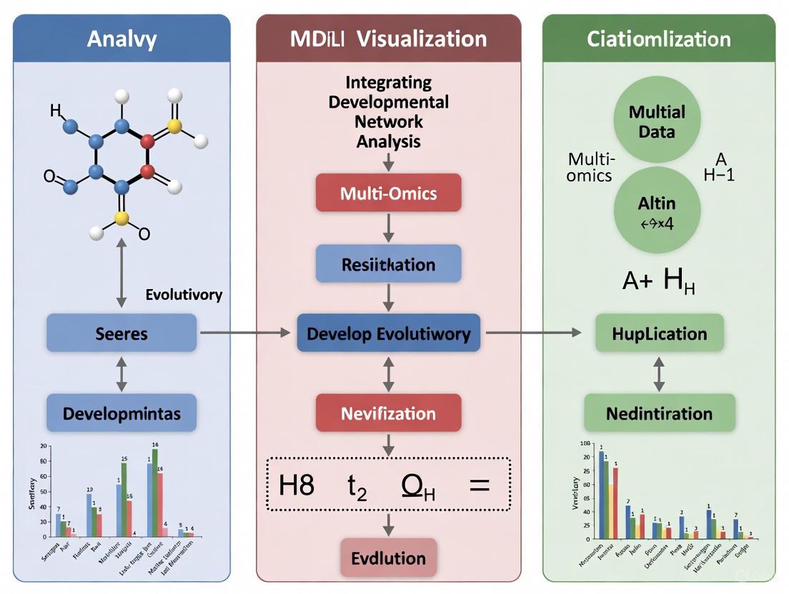 The primary challenge in multi-omics integration lies in the inherent characteristics of the data: extreme heterogeneity, sparsity, and high-dimensionality, often coupled with relatively small sample sizes despite advancements in data collection technologies [7]. Network-based approaches help address these challenges by providing a structured way to model and represent relationships either drawn directly from features in the dataset using pre-existing knowledge graphs or inferred to identify novel relationships [7]. This framework is particularly valuable for developmental network analysis, where understanding the dynamic interactions across molecular layers can reveal critical insights into developmental processes and pathways.