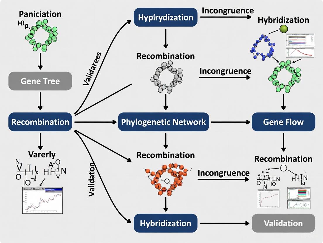 Understanding these conflicts is crucial for validating phylogenetic networks against gene trees. The growing recognition of these processes has transformed phylogenetic inference, moving the field beyond strictly tree-like models to approaches that accommodate complex evolutionary scenarios [12]. This guide objectively compares how these biological sources of conflict impact phylogenetic inference, summarizes experimental approaches for distinguishing them, and provides methodological frameworks for researchers working with genomic data.